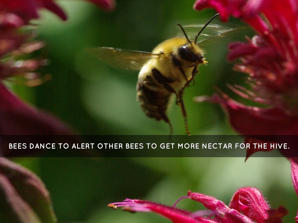 BEES DANCE TO ALERT OTHER BEES TO GET MORE NECTAR FOR THE HIVE.