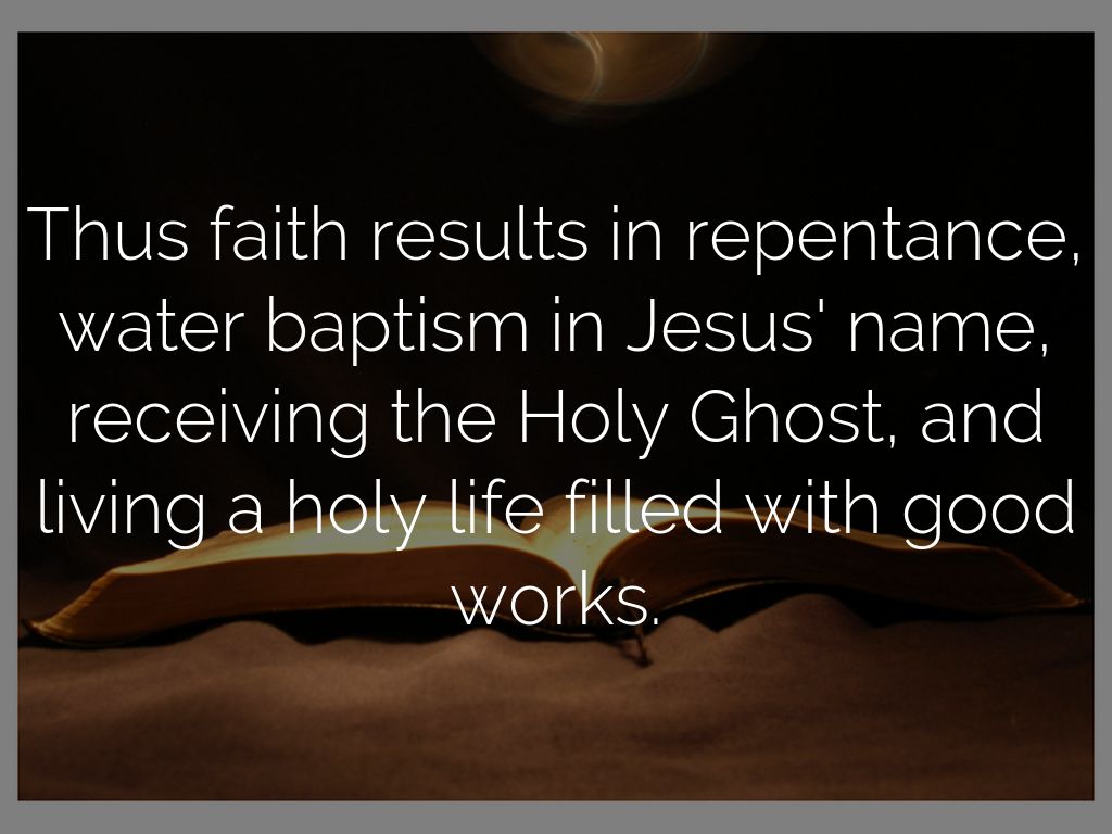 Thus faith results in repentance, water baptism in Jesus' name, receiving the Holy Ghost, and living a holy life filled with good works.