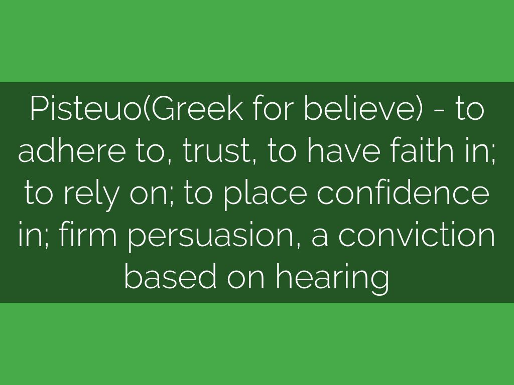 Pisteuo(Greek for believe) - to adhere to, trust, to have faith in; to rely on; to place confidence in; firm persuasion, a conviction based on hearing