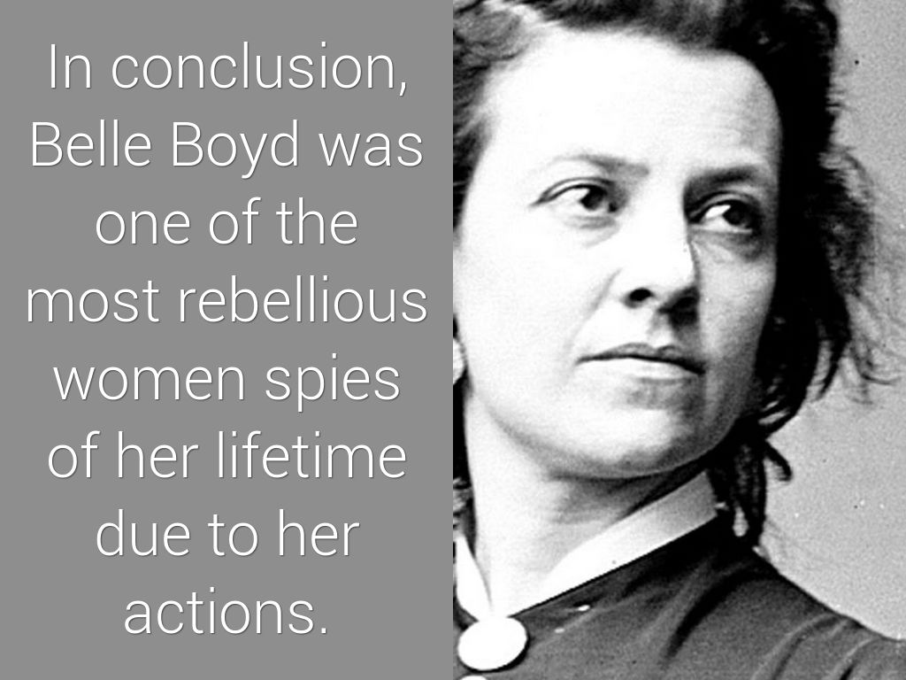 In conclusion, Belle Boyd was one of the most rebellious women spies of her lifetime due to her actions.