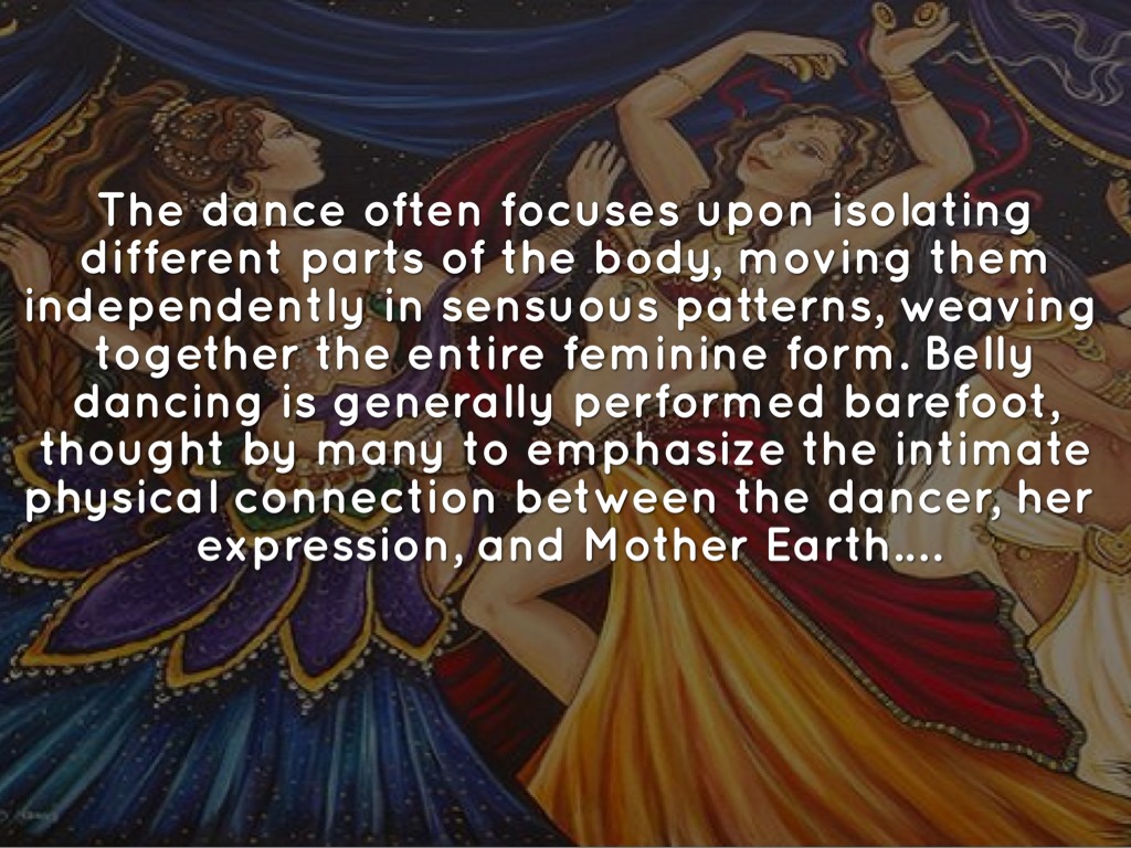 The dance often focuses upon isolating different parts of the body, moving them independently in sensuous patterns, weaving together the entire feminine form. Belly dancing is generally performed barefoot, thought by many to emphasize the intimate physical connection between the dancer, her expression, and Mother Earth.