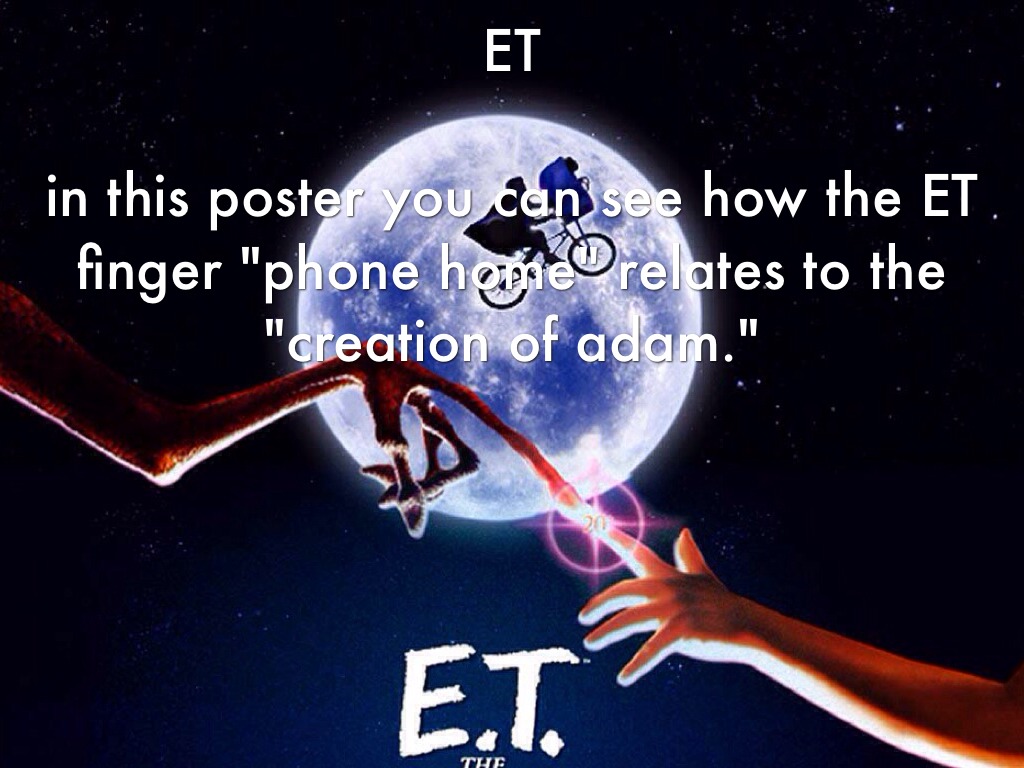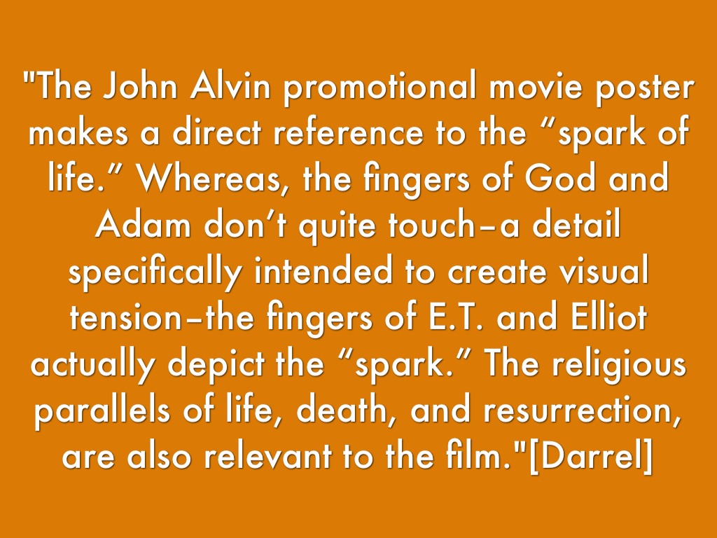 "The John Alvin promotional movie poster makes a direct reference to the “spark of life.” Whereas, the fingers of God and Adam don’t quite touch–a detail specifically intended to create visual tension–the fingers of E.T. and Elliot actually depict the “spark.” The religious parallels of life, death, and resurrection, are also relevant to the film."[Darrel]