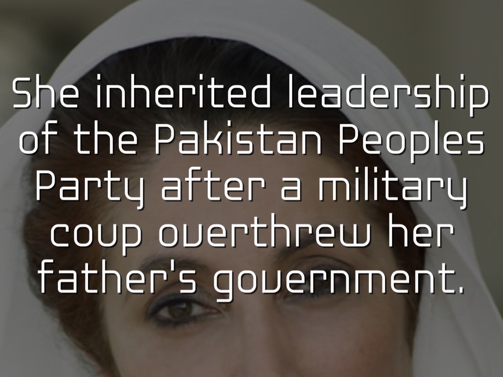 She inherited leadership of the Pakistan Peoples Party after a military coup overthrew her father's government.