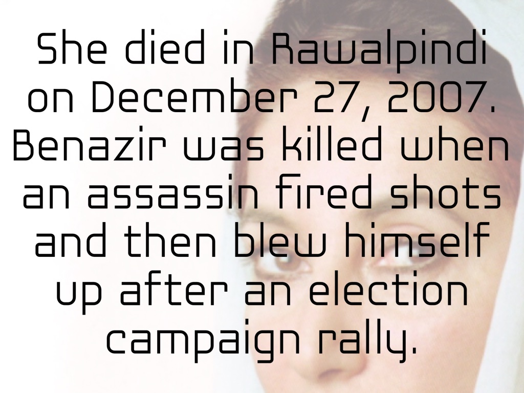 She died in Rawalpindi on December 27, 2007. Benazir was killed when an assassin fired shots and then blew himself up after an election campaign rally.