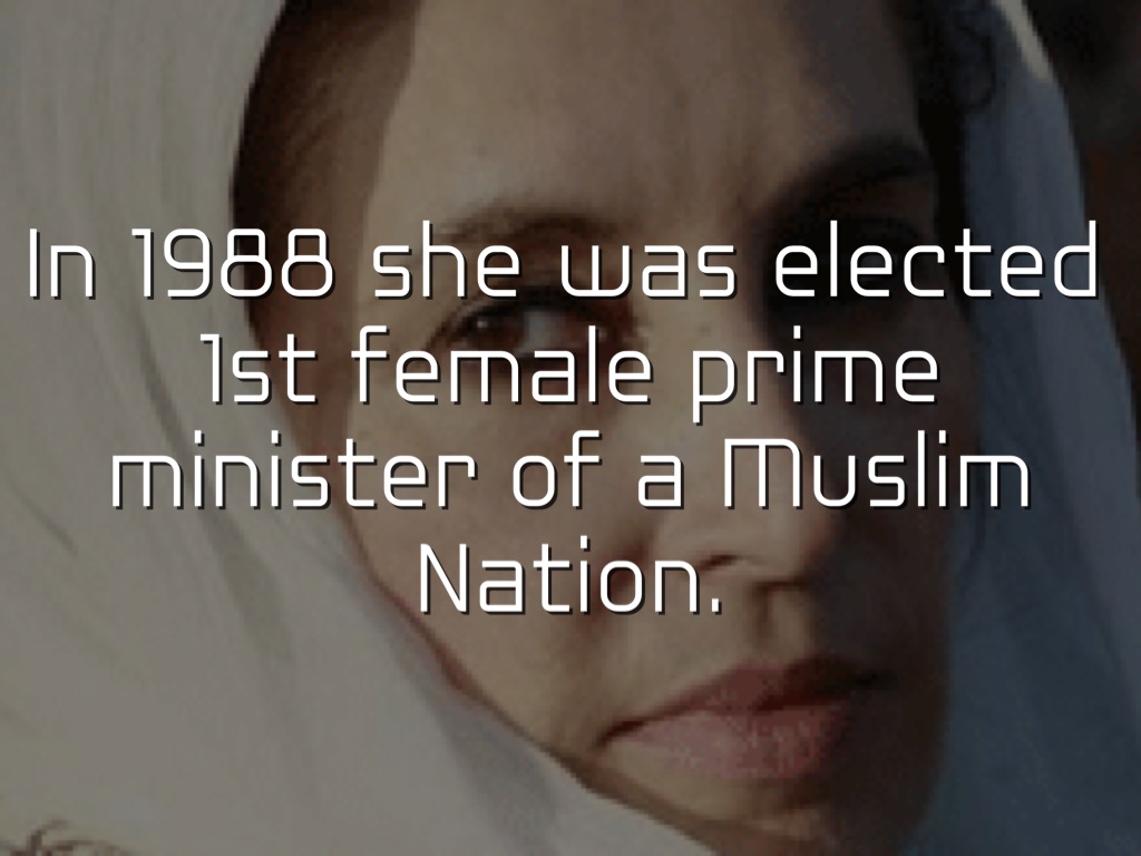 In 1988 she was elected 1st female prime minister of a Muslim Nation.