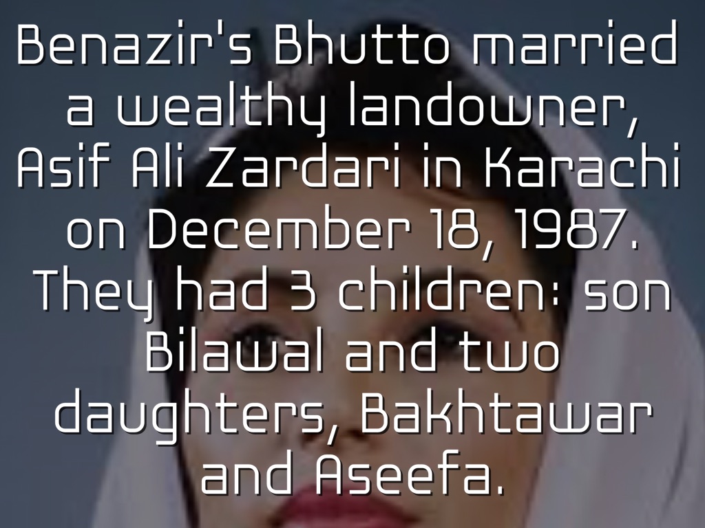 Benazir's Bhutto married a wealthy landowner, Asif Ali Zardari in Karachi on December 18, 1987. They had 3 children: son Bilawal and two daughters, Bakhtawar and Aseefa.