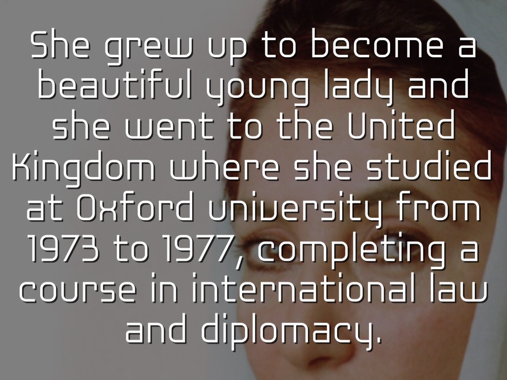 She grew up to become a beautiful young lady and she went to the United Kingdom where she studied at Oxford university from 1973 to 1977, completing a course in international law and diplomacy.
