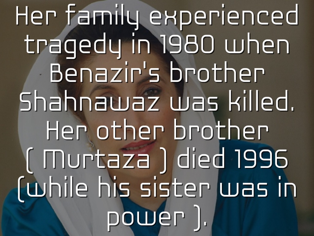 Her family experienced tragedy in 1980 when Benazir's brother Shahnawaz was killed. Her other brother ( Murtaza ) died 1996 (while his sister was in power ).
