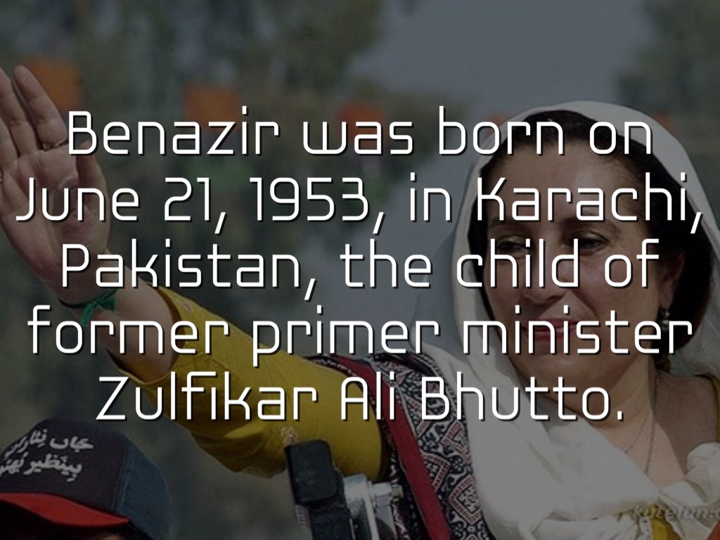 Benazir was born on June 21, 1953, in Karachi, Pakistan, the child of former primer minister Zulfikar Ali Bhutto.