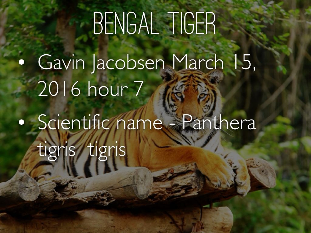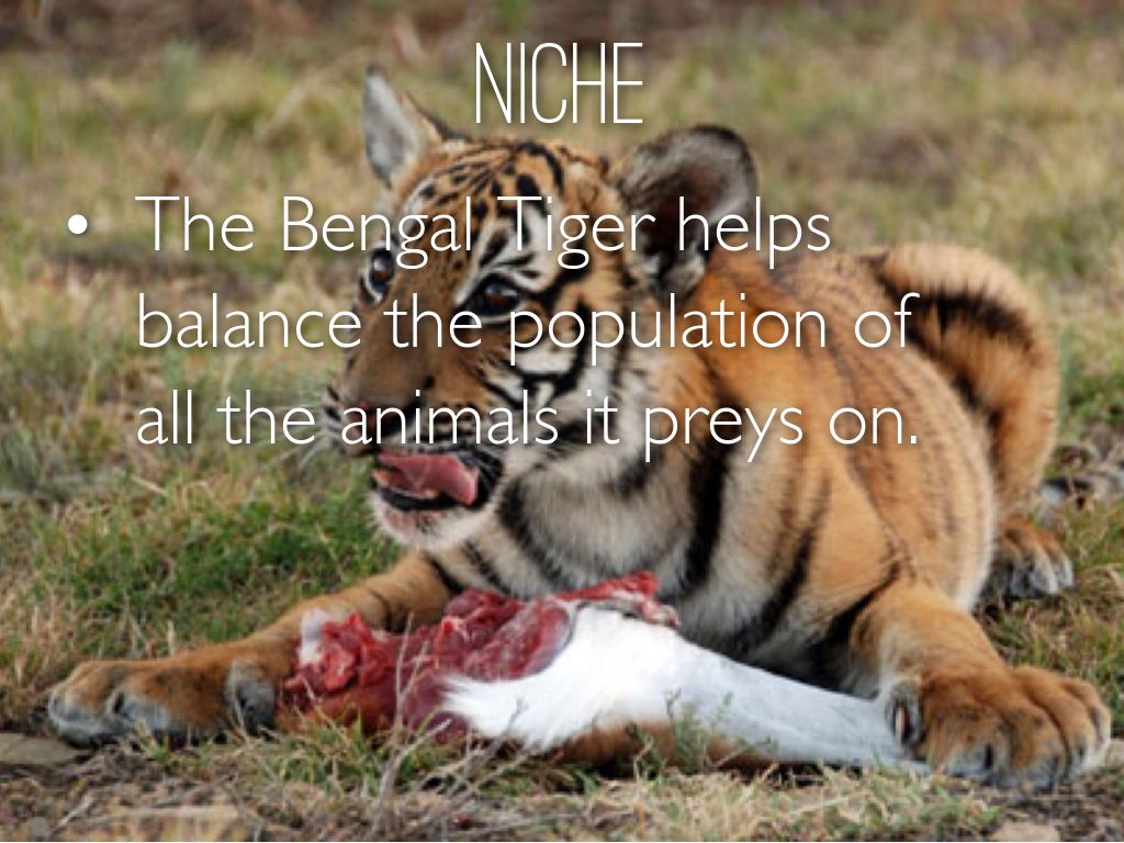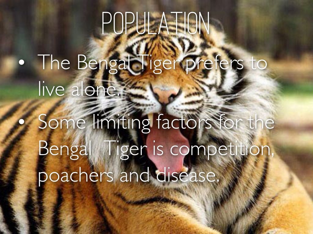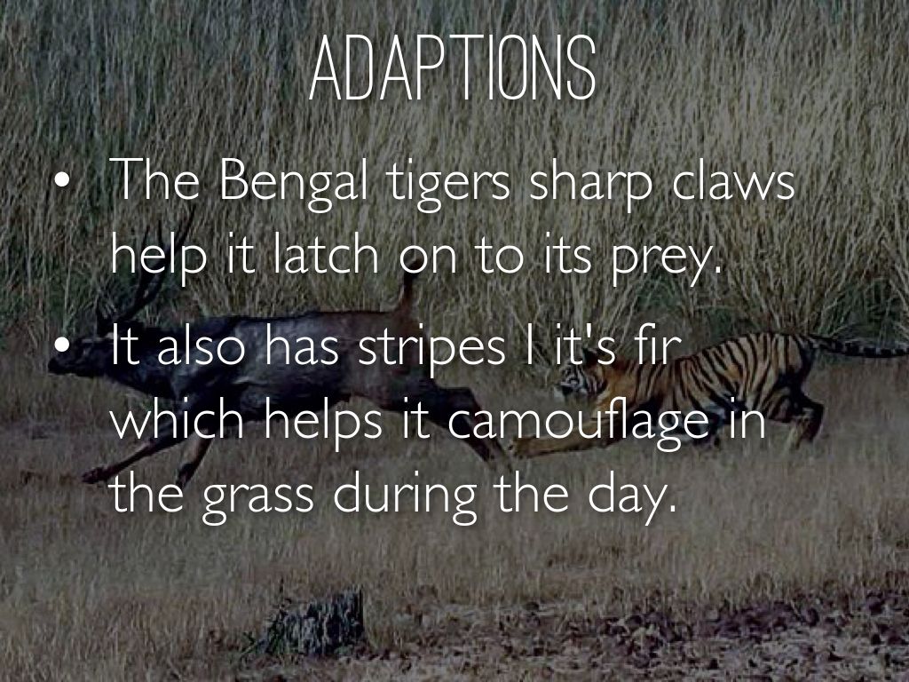 The Bengal Tiger lives in mangroves, grasslands, subtropical and tropical rainforests. Three essential things it needs in its habitats is a water source, grass and trees.