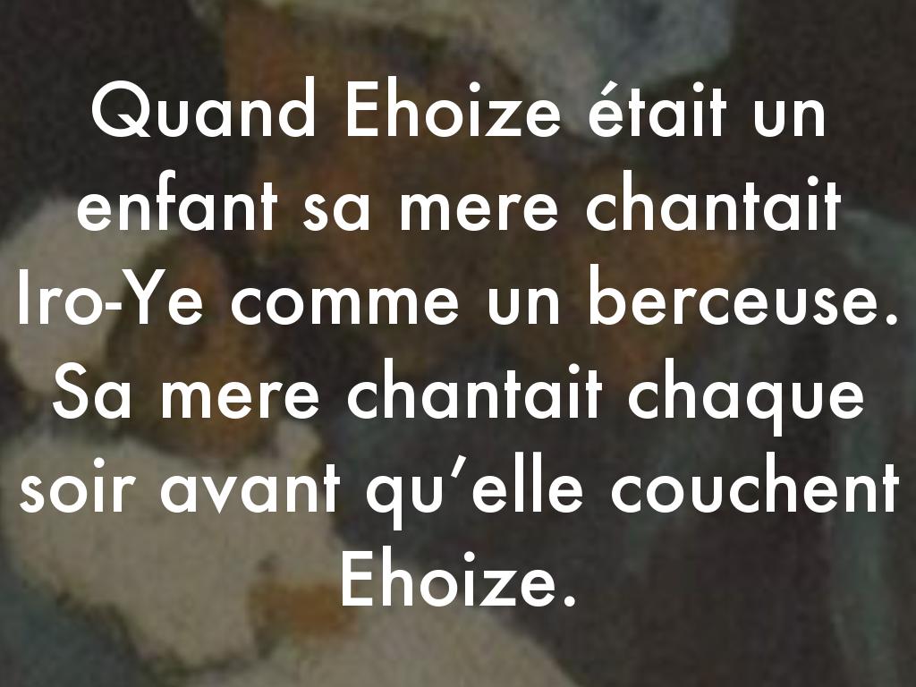 Quand Ehoize était un enfant sa mere chantait Iro-Ye comme un berceuse. Sa mere chantait chaque soir avant qu’elle couchent Ehoize.