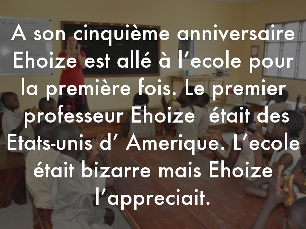 A son cinquième anniversaire Ehoize est allé à l’ecole pour la première fois. Le premier professeur Ehoize était des Etats-unis d’ Amerique. L’ecole était bizarre mais Ehoize l’appreciait.