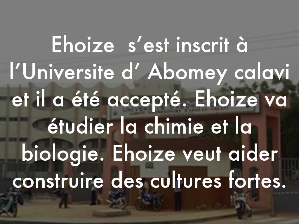 Ehoize s’est inscrit à l’Universite d’ Abomey calavi et il a été accepté. Ehoize va étudier la chimie et la biologie. Ehoize veut aider construire des cultures fortes.
