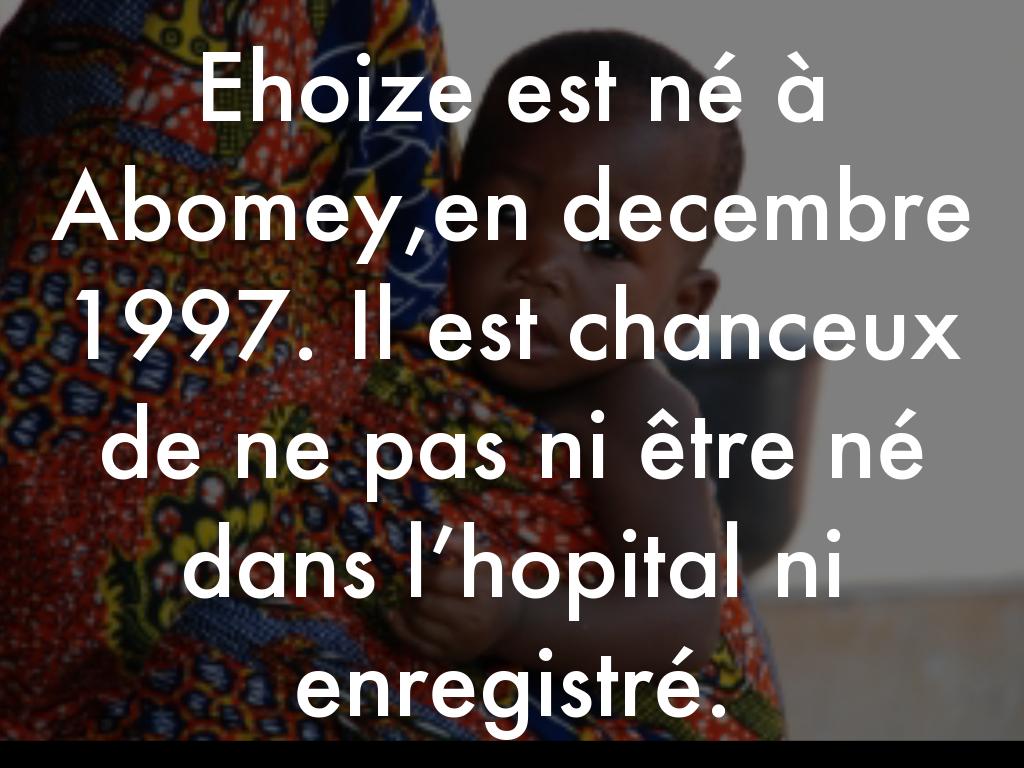 Ehoize est né à Abomey,en decembre 1997. Il est chanceux de ne pas ni être né dans l’hopital ni enregistré.