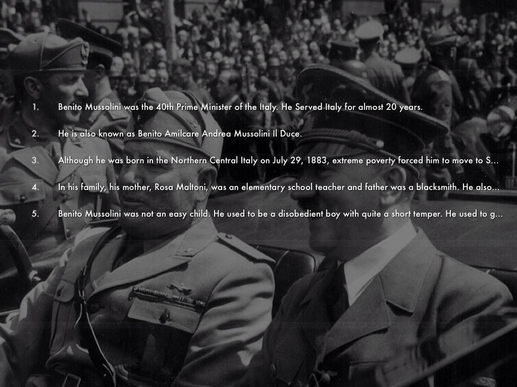 Benito Mussolini was the 40th Prime Minister of the Italy. He Served Italy for almost 20 years.