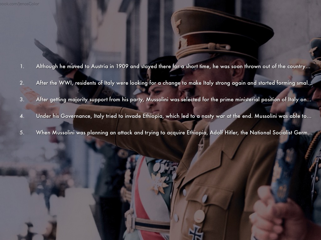 Under his Governance, Italy tried to invade Ethiopia, which led to a nasty war at the end. Mussolini was able to acquire Ethiopia in 1936.