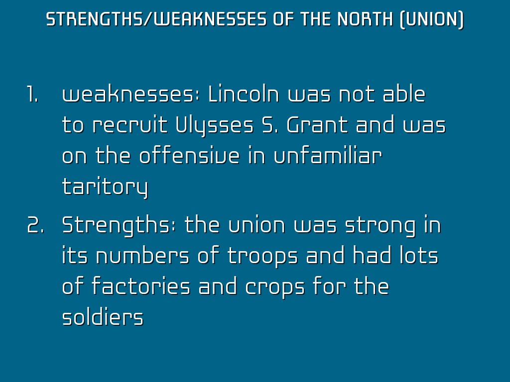 Strengths: the union was strong in its numbers of troops and had lots of factories and crops for the soldiers