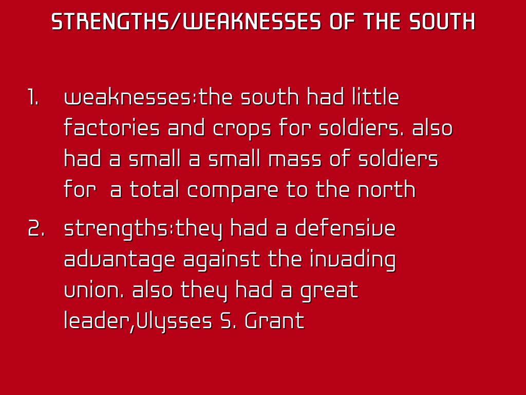 weaknesses:the south had little factories and crops for soldiers. also had a small a small mass of soldiers for a total compare to the north