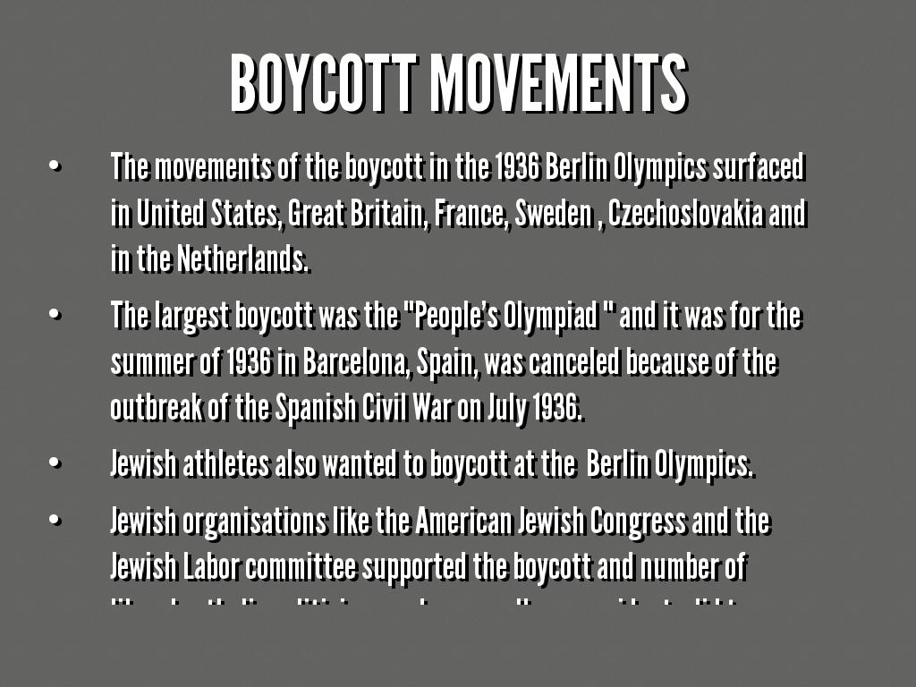 The largest boycott was the ""People's Olympiad "" and it was for the summer of 1936 in Barcelona, Spain, was canceled because of the outbreak of the Spanish Civil War on July 1936.