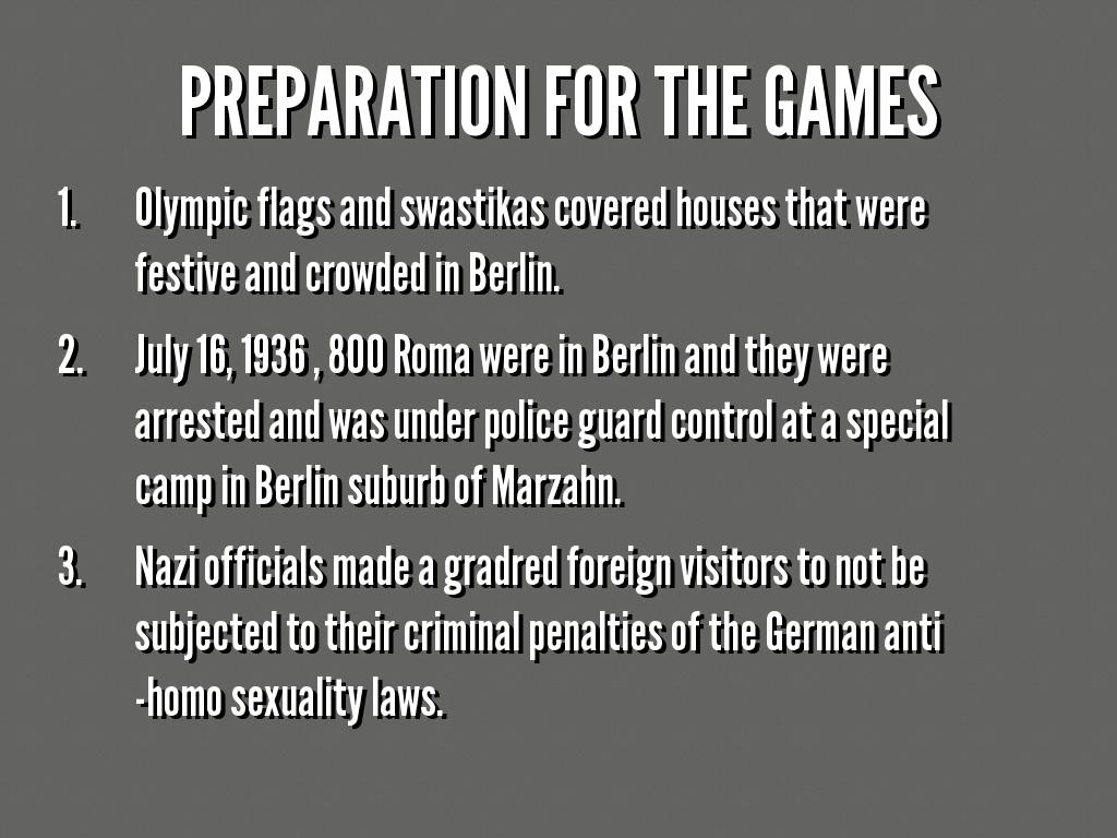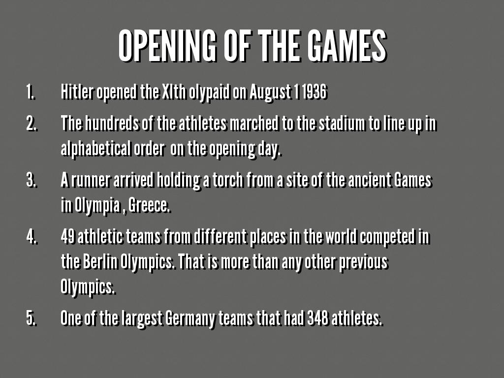 The 1936 Berlin Olympic Games had been handed to Berlin before the Nazis came to power but now it was the perfect opportunity for Hitler to demonstrate to the world, how efficient the Nazi Germany was. It was also the perfect opportunity for the Nazis to prove to the world the reality of the Master Race. The Berlin Olympic Games to paint a false image of the Nazi Party and pushed propaganda to advance their cause and give them an opportunity to prove their Aryan race was superior then anyone else's.