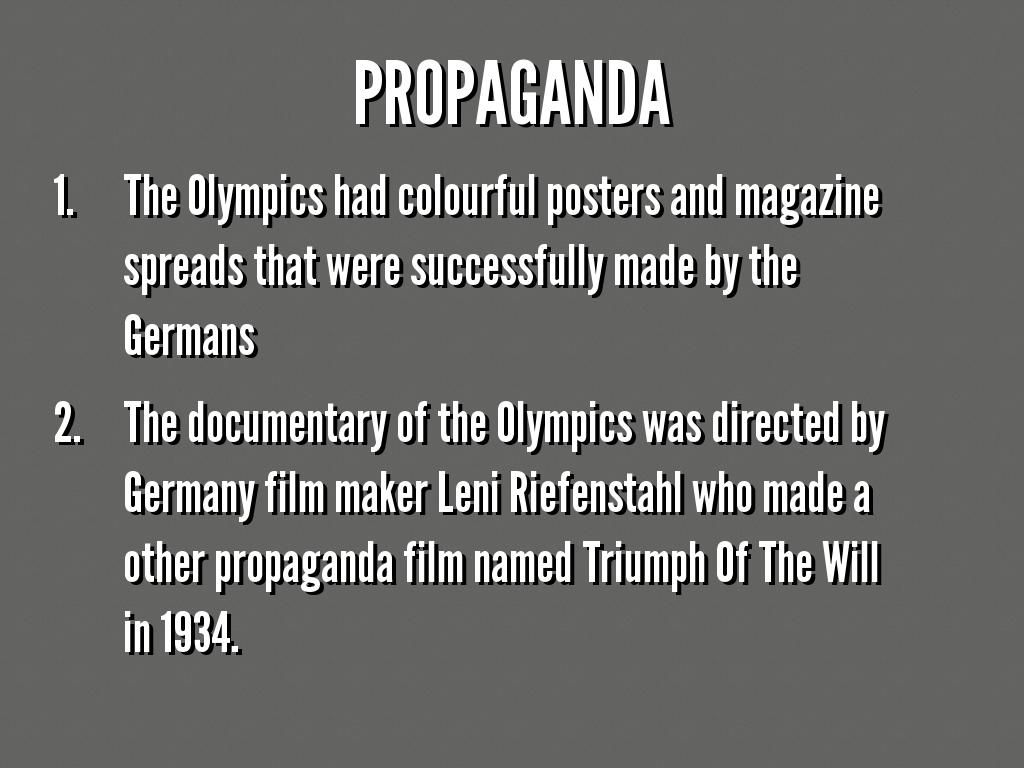 The documentary of the Olympics was directed by Germany film maker Leni Riefenstahl who made a other propaganda film named Triumph Of The Will in 1934.