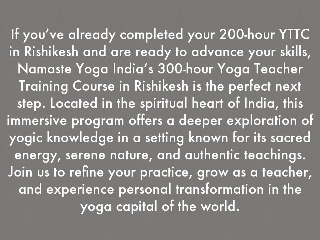 The 300-Hour Yoga Teacher Training at Namaste Yoga India begins with a comprehensive introduction to key yogic disciplines including Yoga, Ayurveda, Meditation, Pranayama, Mudra, and Nada Yoga. This opening session sets the foundation for your 28-day journey in Rishikesh, offering clarity and structure for what lies ahead. You'll also receive essential guidance on ethical practices and safety measures to ensure a mindful and injury-free experience. With this strong base, you’ll be well-prepared to dive deeper into your practice and teacher training journey with confidence and focus. Website: