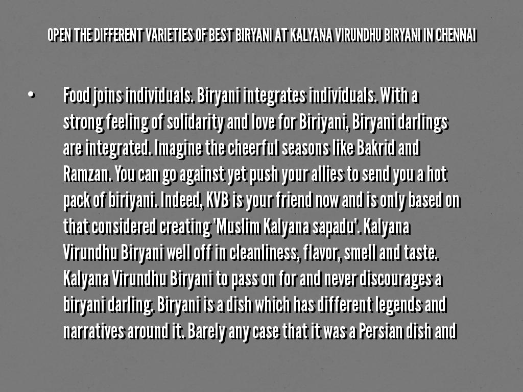 • Food joins individuals. Biryani integrates individuals. With a strong feeling of solidarity and love for Biriyani, Biryani darlings are integrated. Imagine the cheerful seasons like Bakrid and Ramzan. You can go against yet push your allies to send you a hot pack of biriyani. Indeed, KVB is your friend now and is only based on that considered creating 'Muslim Kalyana sapadu'. Kalyana Virundhu Biryani well off in cleanliness, flavor, smell and taste. Kalyana Virundhu Biryani to pass on for and never discourages a biryani darling. Biryani is a dish which has different legends and narratives around it. Barely any case that it was a Persian dish and was acquainted with India by the Mughals and relatively few others promise it was bought to India by Turk-Mongols. Anything that may be it, Biryani is comprehensively gotten a kick out of and consumed by a great numerous individuals all over the planet. Besides, the one thing about Biryani is that it satisfies and satisfies individuals, everything being equivalent. Biryani passes different flavors and differences according on to the making. Biryani changes in design and flavor in better places according to the close by's preferences. Why Kalyana Virundhu Biryani is your best Choice? There are a truly various habits by which Biryani is prepared in South India. There are different kinds of Biryani like the Hyderabadi Biryani, Ambur Biryani, Chettinadu Biryani, Malabar biryani, Bhatkali Biryani, Dindigul Biryani, and extensively more. For any situation, Kalyana Virundhu Biryani is most likely the best biryani In Chennai that has different ways to deal with making and flavors Taste to go with. None of The kinds of Biryani forgets to surprise or satisfy the Biryani darlings, and But Kalyana Virundhu Biryani made Best Tasty Biryani in Chennai.