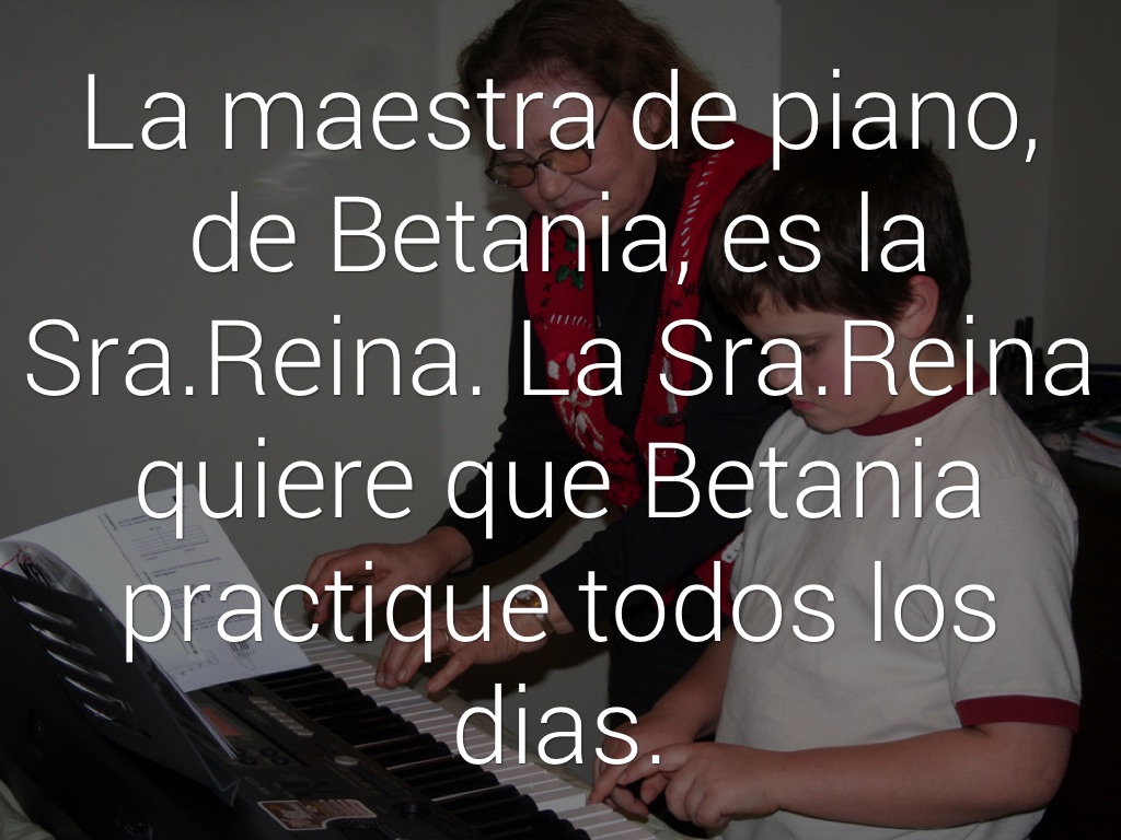 La maestra de piano, de Betania, es la Sra.Reina. La Sra.Reina quiere que Betania practique todos los dias.