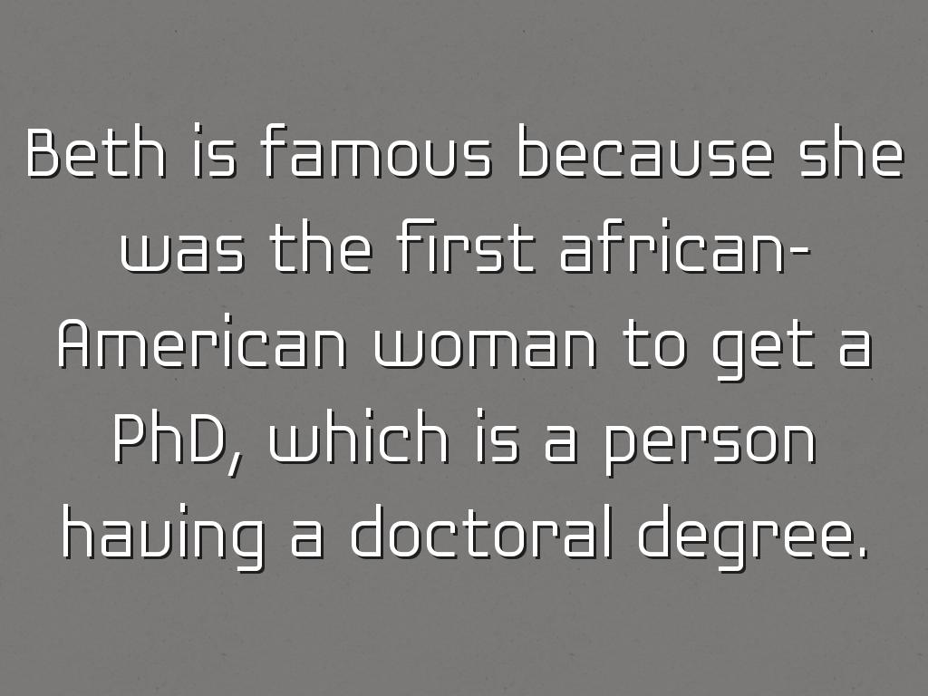 Beth is famous because she was the first african-American woman to get a PhD, which is a person having a doctoral degree.