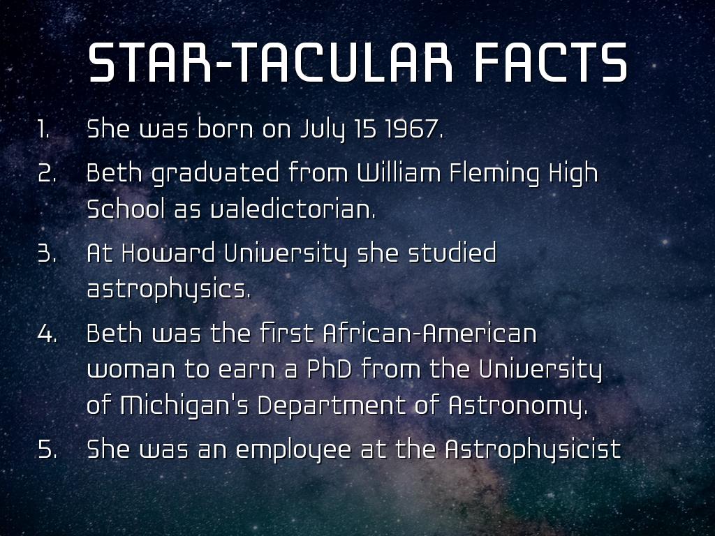 • Beth was the first African-American woman to earn a PhD from the University of Michigan's Department of Astronomy.