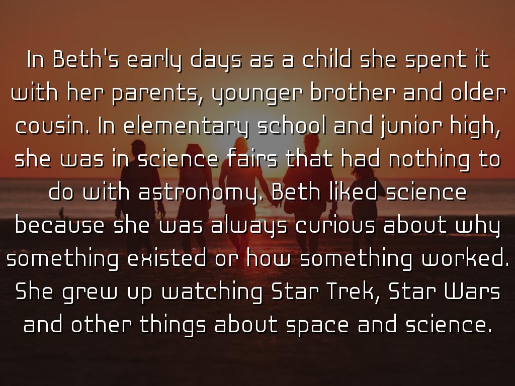 In Beth's early days as a child she spent it with her parents, younger brother and older cousin. In elementary school and junior high, she was in science fairs that had nothing to do with astronomy. Beth liked science because she was always curious about why something existed or how something worked. She grew up watching Star Trek, Star Wars and other things about space and science.