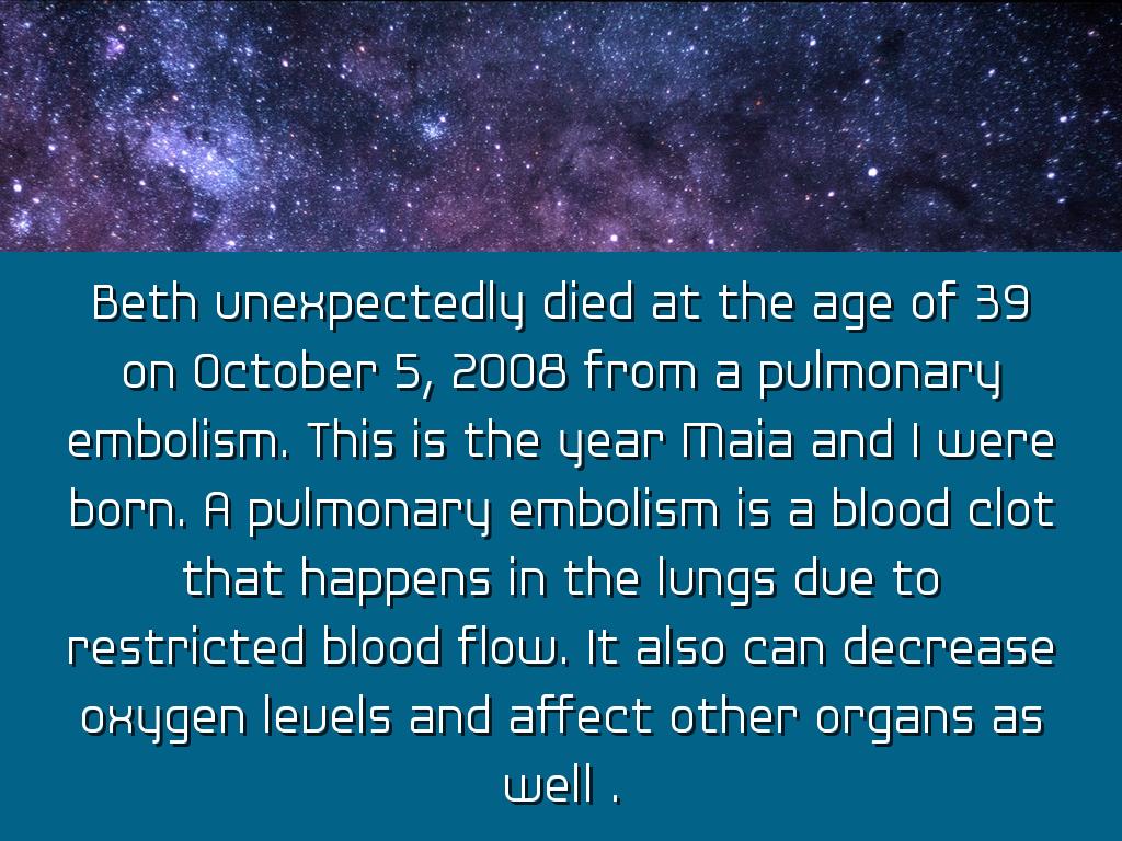 Beth unexpectedly died at the age of 39 on October 5, 2008 from a pulmonary embolism. This is the year Maia and I were born. A pulmonary embolism is a blood clot that happens in the lungs due to restricted blood flow. It also can decrease oxygen levels and affect other organs as well .