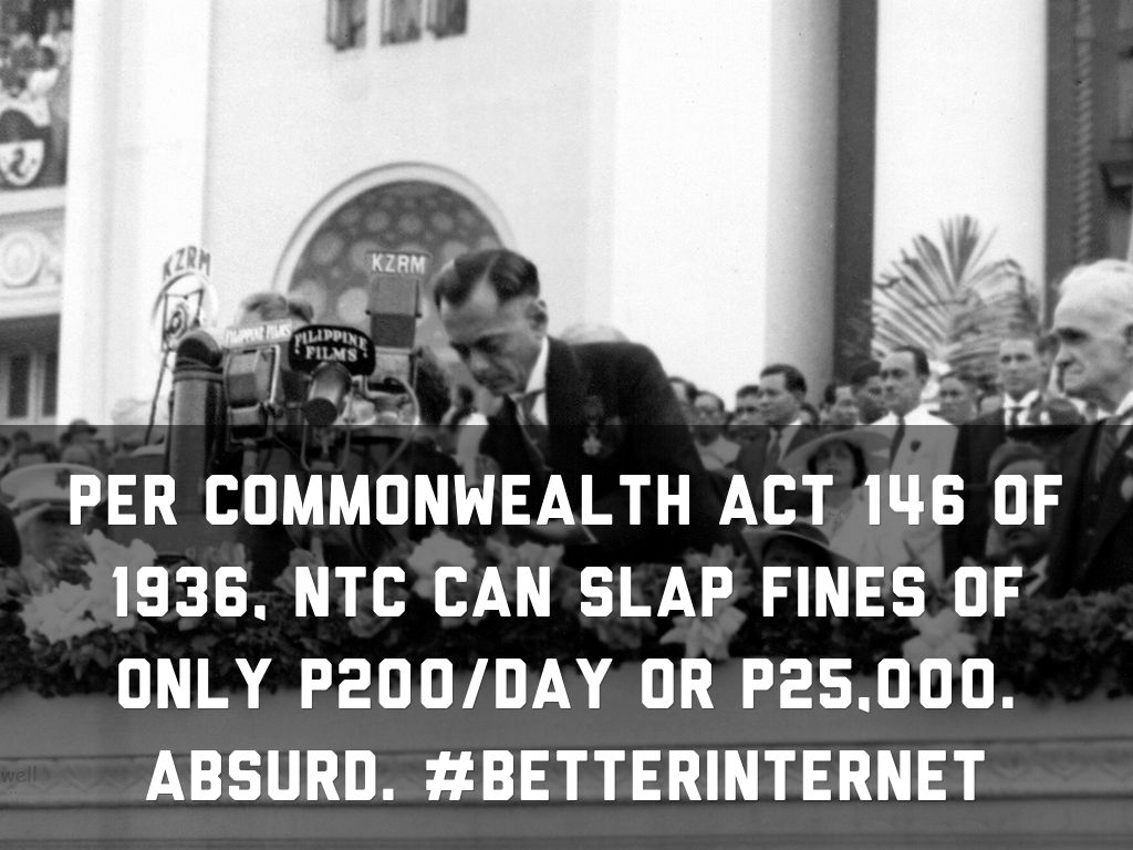 Per Commonwealth Act 146 of 1936, NTC can slap fines of only P200/day or P25,000. Absurd. #BETTERINTERNET