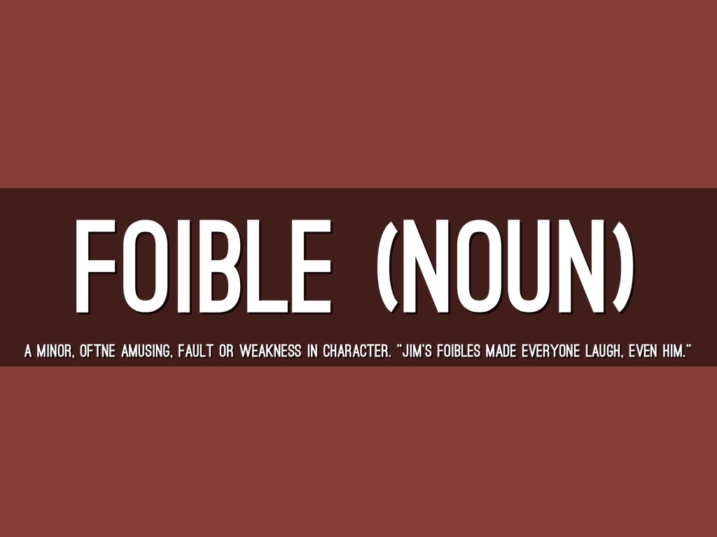 A MINOR, OFTNE AMUSING, FAULT OR WEAKNESS IN CHARACTER. "JIM'S FOIBLES MADE EVERYONE LAUGH, EVEN HIM."