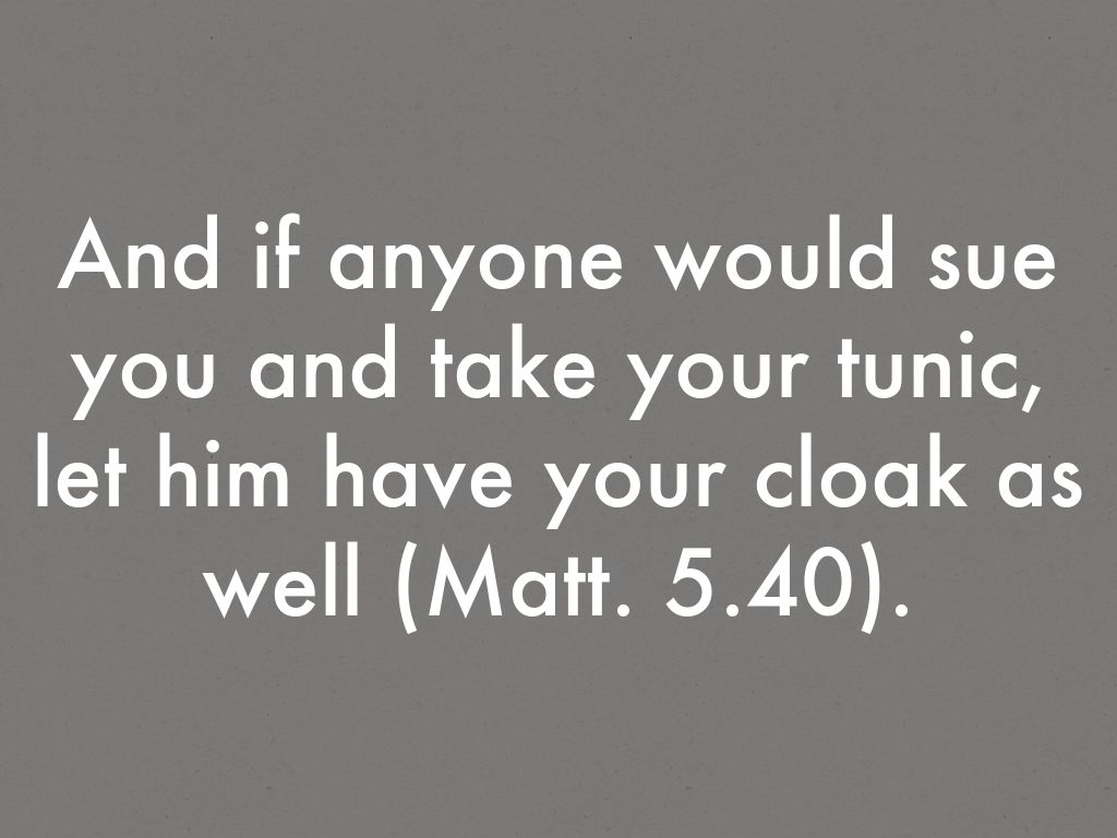 And if anyone would sue you and take your tunic, let him have your cloak as well (Matt. 5.40).