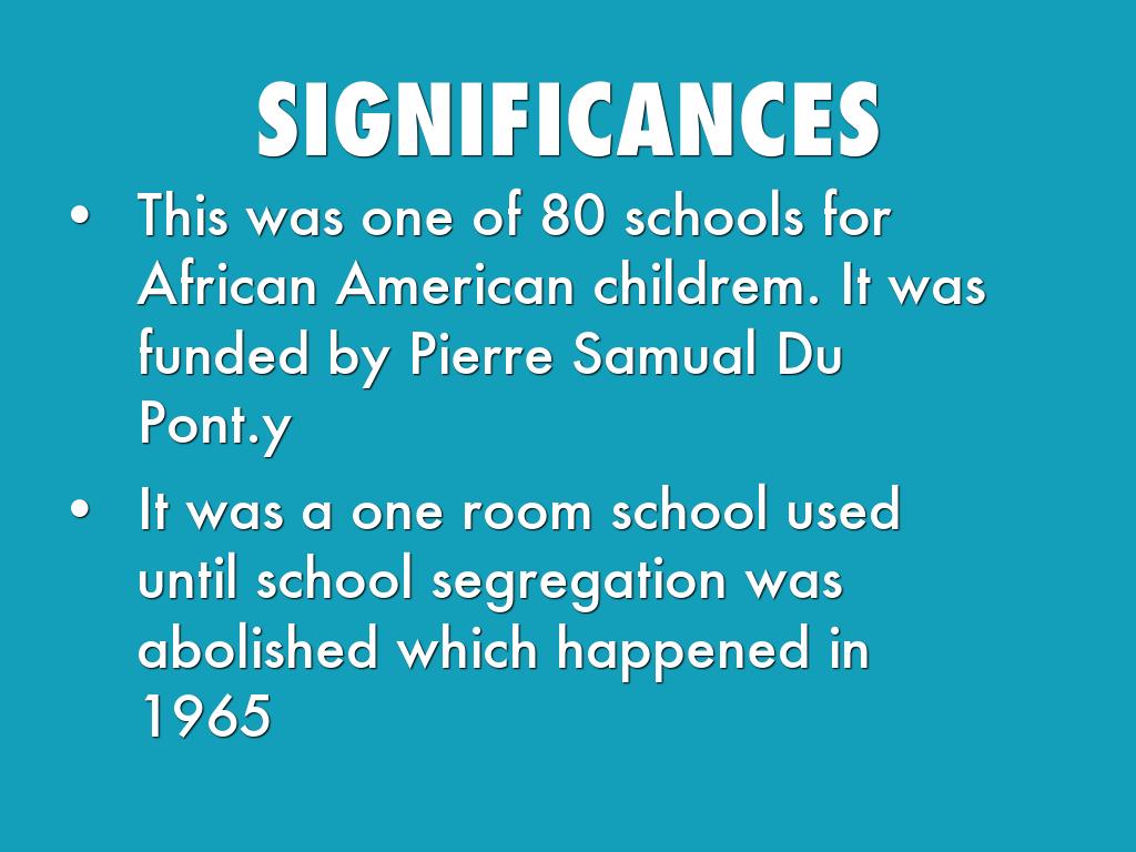 • This was one of 80 schools for African American childrem. It was funded by Pierre Samual Du Pont.y