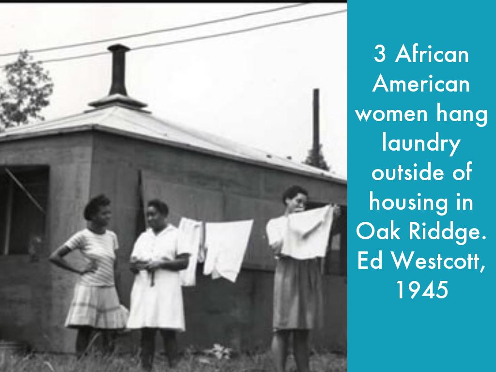 3 African American women hang laundry outside of housing in Oak Riddge.