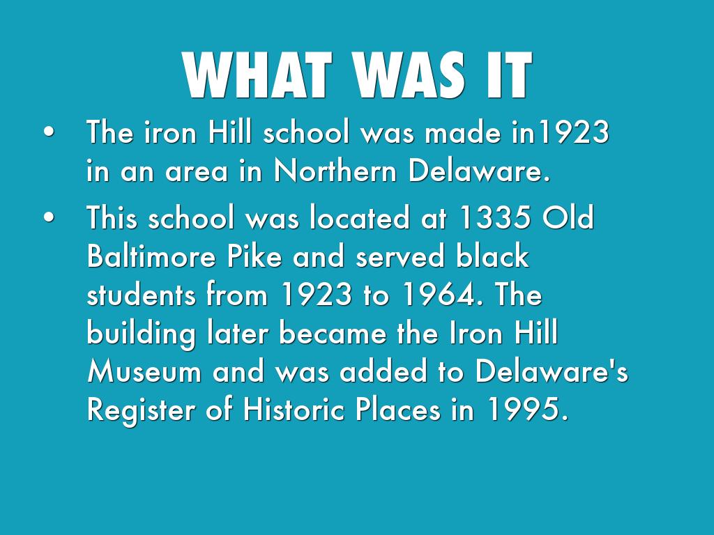 • The iron Hill school was made in1923 in an area in Northern Delaware.