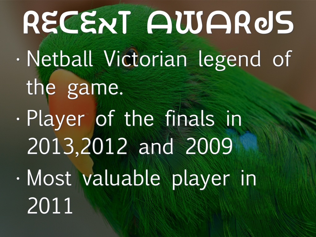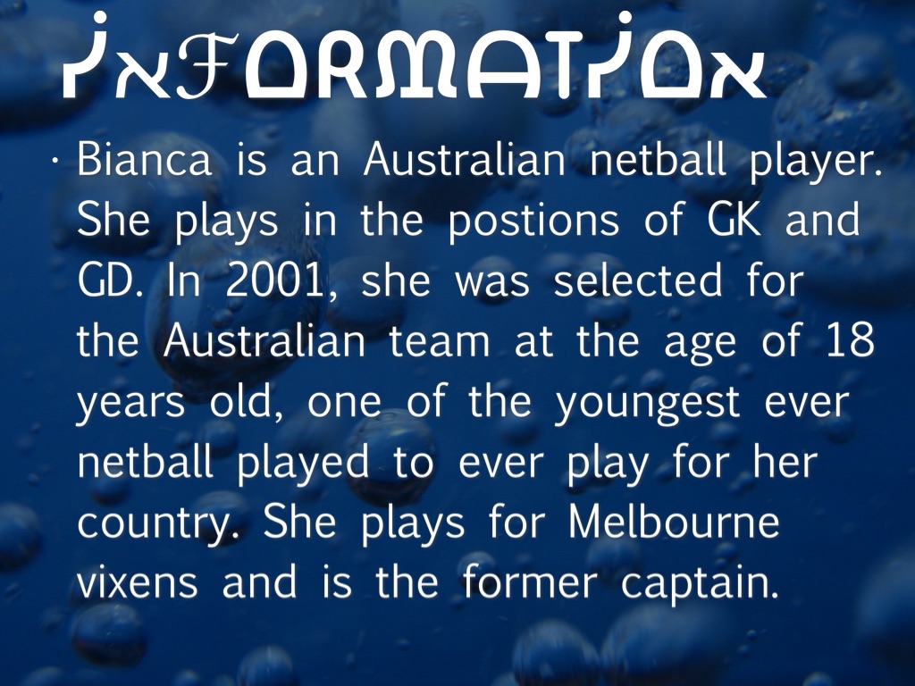 Bianca is an Australian netball player. She plays in the postions of GK and GD. In 2001, she was selected for the Australian team at the age of 18 years old, one of the youngest ever netball played to ever play for her country. She plays for Melbourne vixens and is the former captain.