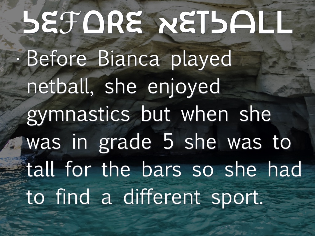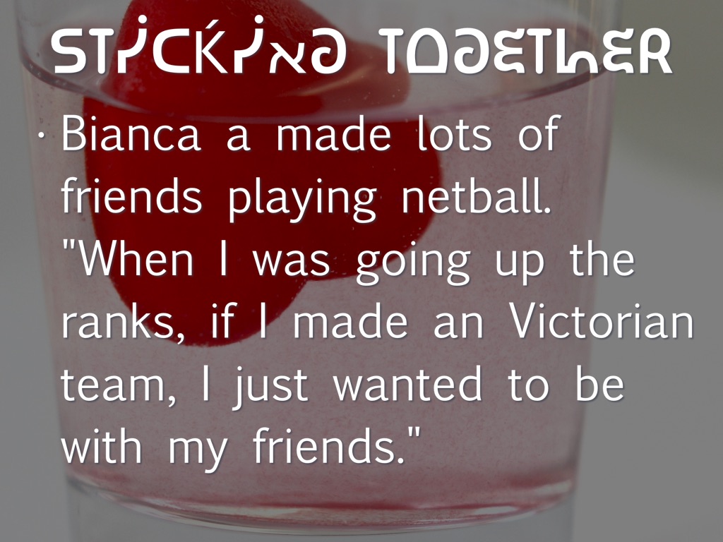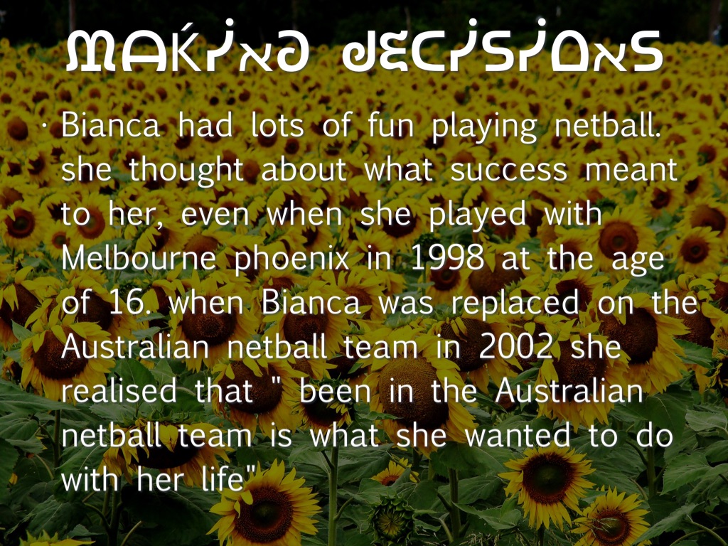Bianca had lots of fun playing netball. she thought about what success meant to her, even when she played with Melbourne phoenix in 1998 at the age of 16. when Bianca was replaced on the Australian netball team in 2002 she realised that " been in the Australian netball team is what she wanted to do with her life"