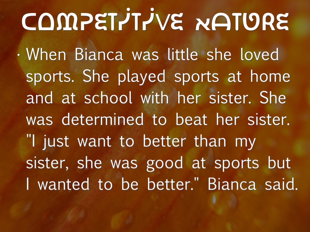 When Bianca was little she loved sports. She played sports at home and at school with her sister. She was determined to beat her sister. "I just want to better than my sister, she was good at sports but I wanted to be better." Bianca said.