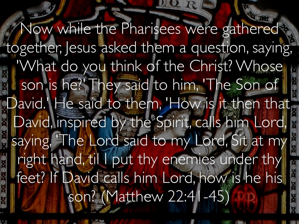 Now while the Pharisees were gathered together, Jesus asked them a question, saying, 'What do you think of the Christ? Whose son is he?' They said to him, 'The Son of David.' He said to them, 'How is it then that David, inspired by the Spirit, calls him Lord, saying, 'The Lord said to my Lord, Sit at my right hand, til I put thy enemies under thy feet? If David calls him Lord, how is he his son? (Matthew 22:41-45)