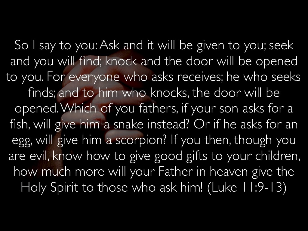 So I say to you: Ask and it will be given to you; seek and you will find; knock and the door will be opened to you. For everyone who asks receives; he who seeks finds; and to him who knocks, the door will be opened. Which of you fathers, if your son asks for a fish, will give him a snake instead? Or if he asks for an egg, will give him a scorpion? If you then, though you are evil, know how to give good gifts to your children, how much more will your Father in heaven give the Holy Spirit to those who ask him! (Luke 11:9-13)