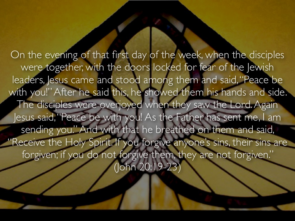 On the evening of that first day of the week, when the disciples were together, with the doors locked for fear of the Jewish leaders, Jesus came and stood among them and said, “Peace be with you!” After he said this, he showed them his hands and side. The disciples were overjoyed when they saw the Lord. Again Jesus said, “Peace be with you! As the Father has sent me, I am sending you.” And with that he breathed on them and said, “Receive the Holy Spirit. If you forgive anyone’s sins, their sins are forgiven; if you do not forgive them, they are not forgiven.” (John 20:19-23)