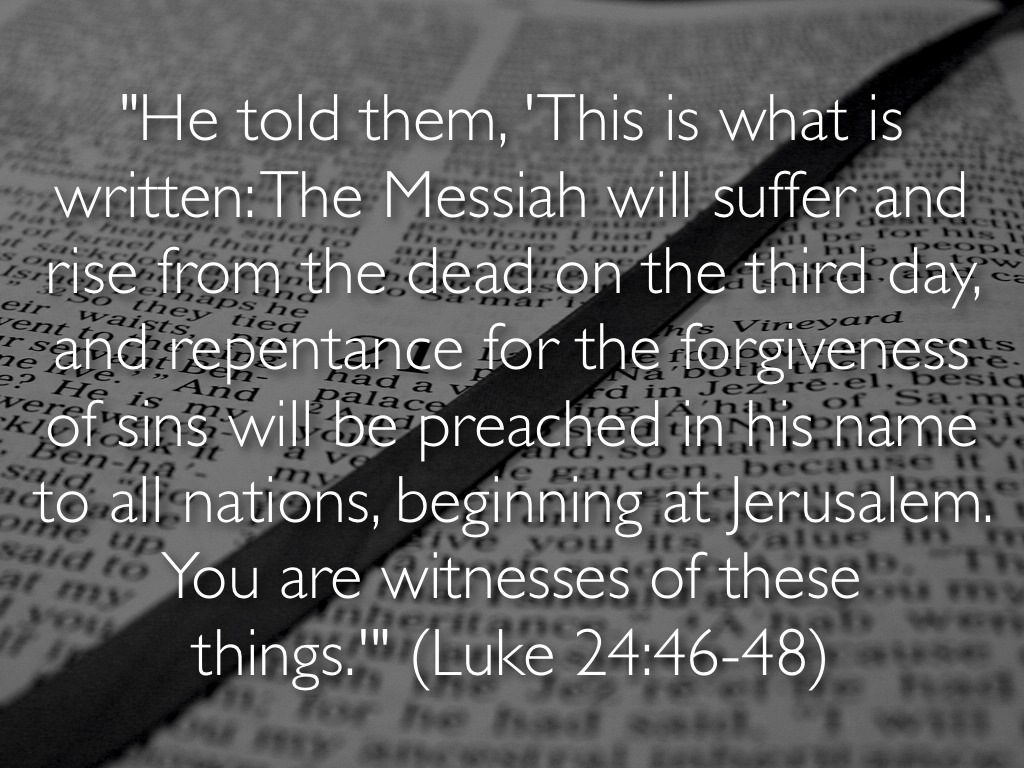 "He told them, 'This is what is written: The Messiah will suffer and rise from the dead on the third day, and repentance for the forgiveness of sins will be preached in his name to all nations, beginning at Jerusalem. You are witnesses of these things.'" (Luke 24:46-48)