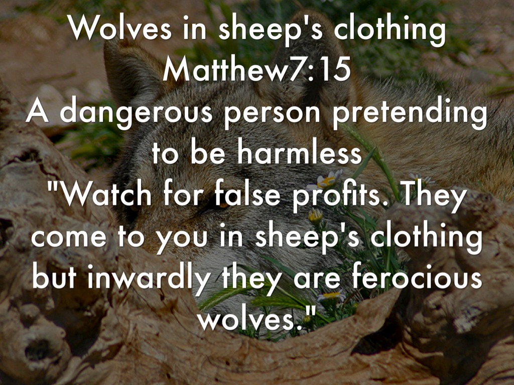 Wolves in sheep's clothing Matthew7:15 A dangerous person pretending to be harmless "Watch for false profits. They come to you in sheep's clothing but inwardly they are ferocious wolves."
