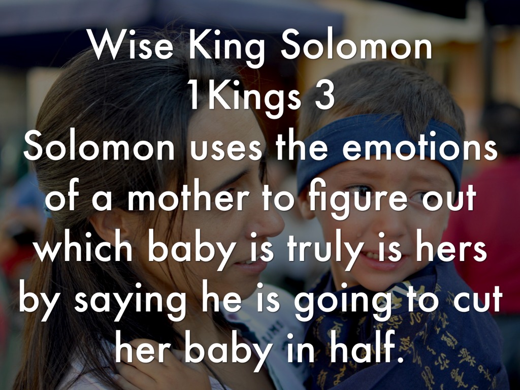 Wise King Solomon 1Kings 3 Solomon uses the emotions of a mother to figure out which baby is truly is hers by saying he is going to cut her baby in half.