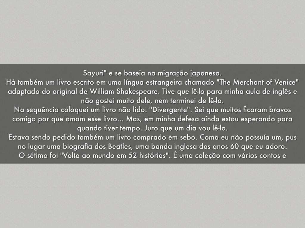 Há também um livro escrito em uma língua estrangeira chamado "The Merchant of Venice" adaptado do original de William Shakespeare. Tive que lê-lo para minha aula de inglês e não gostei muito dele, nem terminei de lê-lo.