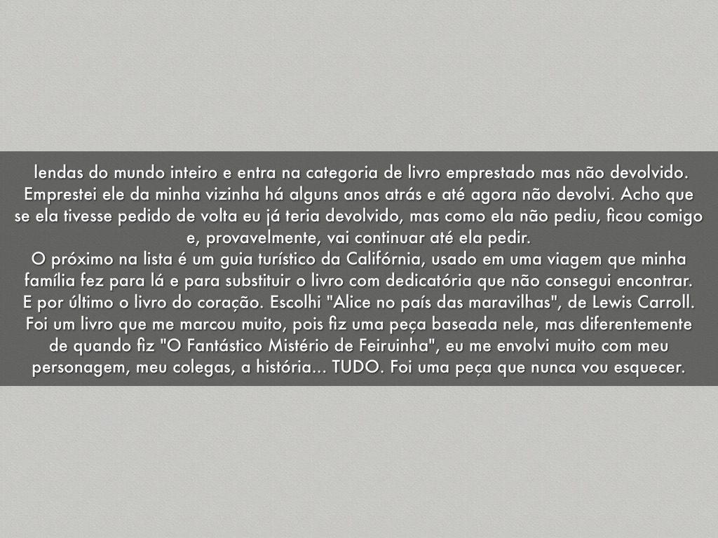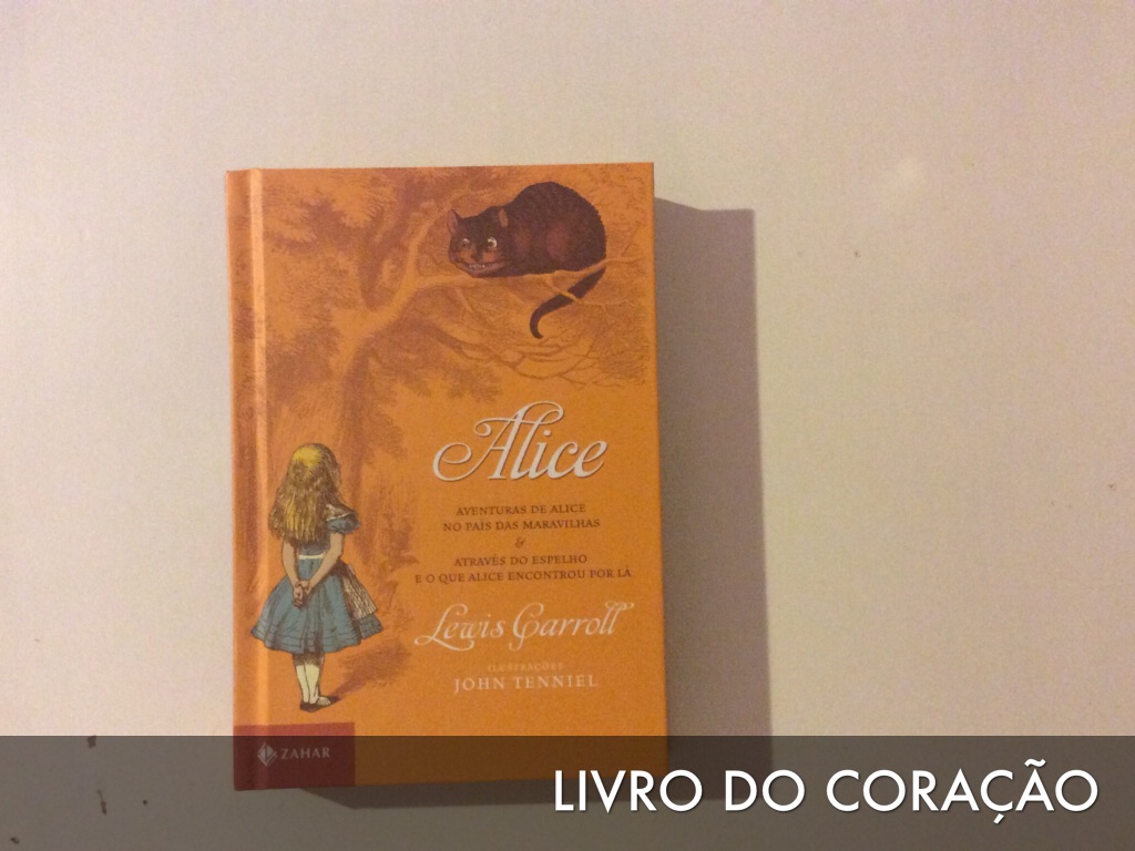E por último o livro do coração. Escolhi "Alice no país das maravilhas", de Lewis Carroll. Foi um livro que me marcou muito, pois fiz uma peça baseada nele, mas diferentemente de quando fiz "O Fantástico Mistério de Feiruinha", eu me envolvi muito com meu personagem, meu colegas, a história... TUDO. Foi uma peça que nunca vou esquecer.