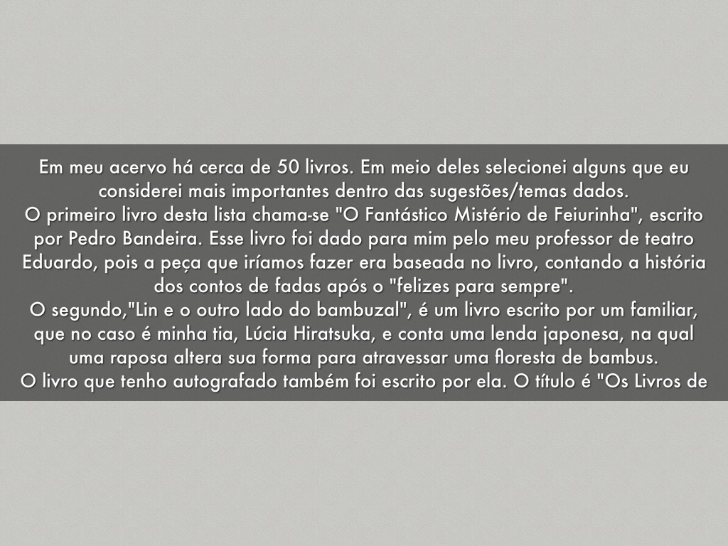 O segundo,"Lin e o outro lado do bambuzal", é um livro escrito por um familiar, que no caso é minha tia, Lúcia Hiratsuka, e conta uma lenda japonesa, na qual uma raposa altera sua forma para atravessar uma floresta de bambus.
